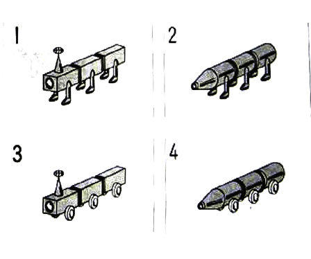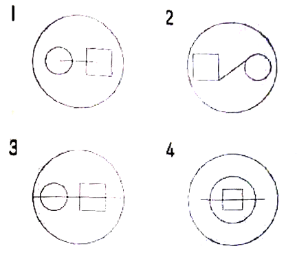 聴解スクリプト: 1-13 男の人が話しています。男の人はどんな形を画いてほしいですか。 男:まず、大きい丸の中に小さい丸を画いて、その隣に四角を書いてください。それから 小さい丸の真中から四角の真中まで線をかいてください。 男の人はどんな形を画いてほしいですか。
