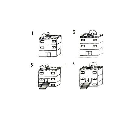 聴解スクリプト: 1-15 男の人と女の人が新しい図書館について話しています。新しい図書館はどれですか。 女:今度できた図書館、もういらっしゃいましたか。 男:ええ。行きましたよ。ちょっと変わっていますね。 女:ええ。建物の屋上が庭になっていて。 男:そうでしたね。びっくりしましたよ。 女:そこに大きな木が一本あって。 男:そうそう。その下にベンチが置いてあって。 女:それから建物の入口。 男:そう。普通は1階にあるんですけどね。 新しい図書館はどれですか。