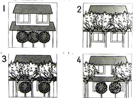 聴解スクリプト: 1-4 男の人と女の人が話しています。木はどのように植えますか。 男:この家、前の家から中が見えちゃうな。 女:そうね。木でも植える? 男:榉なんかどうかな。 女:へええ、榉は背が高くて、下の方に枝や葉がないから、1階は丸見えよ。もっと背の 低い木も植えたほうが・・・。 男:じゃ、背の高いのと低いのを一つ置きにするってのはどう? 女:でも、﨔は枝が広がるから、二つ置きぐらいにしないと。枝と枝が重なっちゃうん じゃない? 男:そうか。じゃ、そうするか。 木はどのように植えますか。