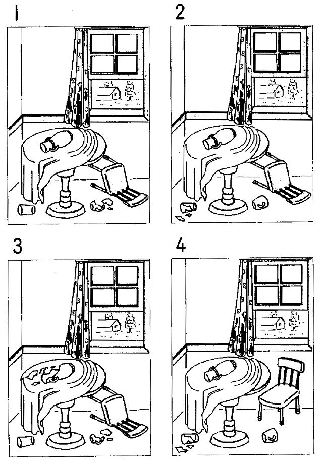 聴解スクリプト: (12) 男の人と女の人が部屋に帰ってきました。部屋はどうなっていますか。 男:いや、大変、泥棒だ。 女:あ、まただわ。これ、猫なんです。前にも何回か入ってきて、この間もカーテンを汚していたので、一昨日取り替えたのに。 男:ひどいですね。椅子も花瓶も倒れているし、花瓶大丈夫ですか。 女:ええ、花瓶は大丈夫です。 男:あ、コーヒーカップとコップも落ちている。コーヒーカップは大丈夫だけど、コップは割れていますよ。 女:ええ。でも、よかった。コーヒーカップは高かったから。 男:窓の閉めるのを忘れないでくださいね。さあ、掃除掃除。 部屋はどうなっていますか。