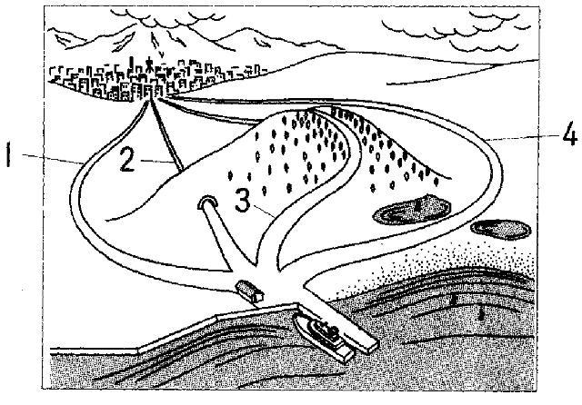 聴解スクリプト: (13) 男の人は会議で自分の意見を言っています。男の人はどこに新しい道を作るのがいいと言っていますか。 男:ええ、この町のためには、、南にある港から、町の真ん中へ行く道が必要です。でも、皆さん、お分かりのように、港と町の間には山や湖があって、道が作りにくい、そこで、今日はどこに道を作ったらいいか、私の考えを言わせていただきます。え、まず、誰でも考えるのが山を登る、山の上を通る道です。しかし、あの山は、雪の季節は大変危険ですので、山の上を通る道はよろしくありません。次に考えるのが、港から町までまっすぐに山の下を通る道です。まあ、トンネルを作ることです。これはいい考えのようですけれども、お金と時間がかかるので、無理でしょう。ですから、ま、私としては、湖と湖の間を通るのが一番いいと思うのです。これは一番遠くなりますけれども、山の西側を回る道より簡単でしょう。山の西側は隣の村ですから、西側に作る場合は、隣の村の意図も聞かなければなりませんからね。 男の人はどこに道を作るのがいいと言っていますか。