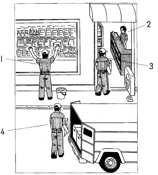聴解スクリプト: (2) 田中君はどの人ですか。 女1:あ、あれ、田中君だ。 女2:田中君って? 女1:同じクラスの人。 女2:ええ、ここでアルバイトをしているんだ。お店の中の人? 女1:ううん、帽子かぶって、荷物を運んでいる。 女2:ええ、ハンサムだね。 女1:ええ?ああ、車のところの人じゃないよ。 女2:ああ。 田中君はどの人ですか。