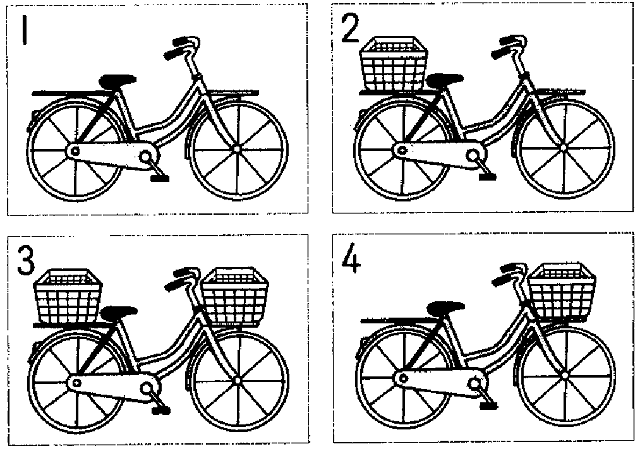 聴解スクリプト: (4) 男の人の自転車は今どうなっていますか。 女:あら、新しい自転車ですか。 男:いいえ、前と同じですよ。 女:そうですか。 男:ただ、荷物を入れるところを変えたんです。 女:はあ。 男:前は後ろにやった荷物入れを前につけたんです。 女:そのほうが便利ですか。 男:そう思ったんですけれど、両方あるほうがいいでしょうかね。 男の人の自転車は今どうなっていますか。