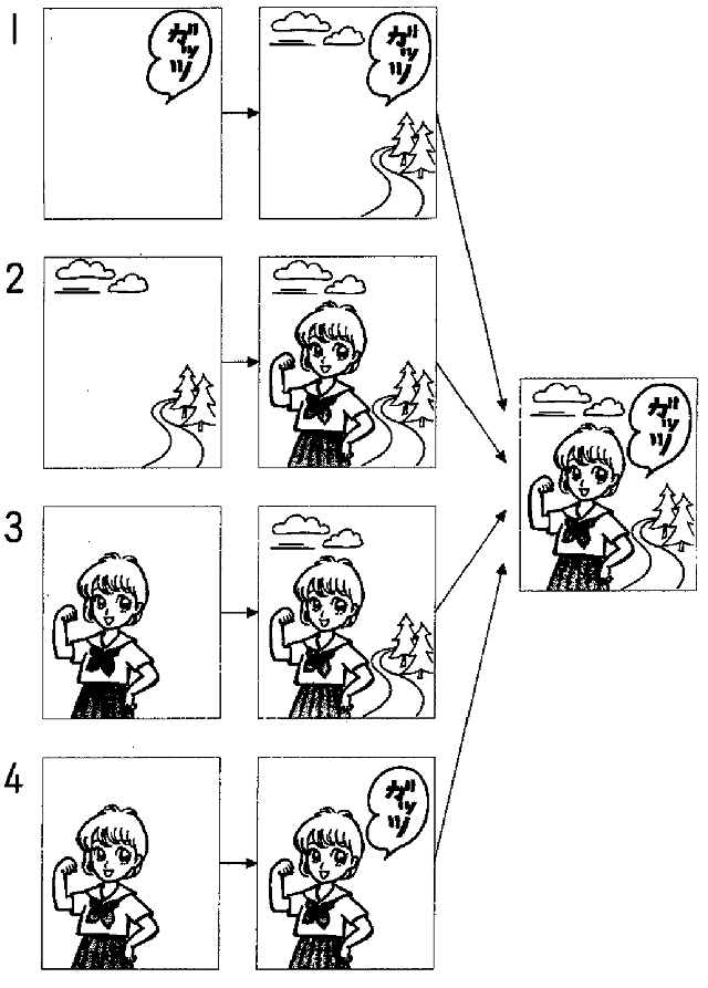 聴解スクリプト: (5) 男の人は漫画をどう書きますか。 女:ええ、上手ですね、漫画。 男:そうでもないけど。これぐらいならね。 女:いつもどうやって書くんですか。まず、人を書くんでしょう。 男:いや、最初に言葉を考えるんだけど、書くのは後ろにあるものから始めて、 女:それから、人ですか。 男:うん。そして、最後に言葉を入れると、できあがるという具合。 女:ええ?今度、書き方を教えてください。 男:いいよ。 男の人は漫画をどう書きますか。