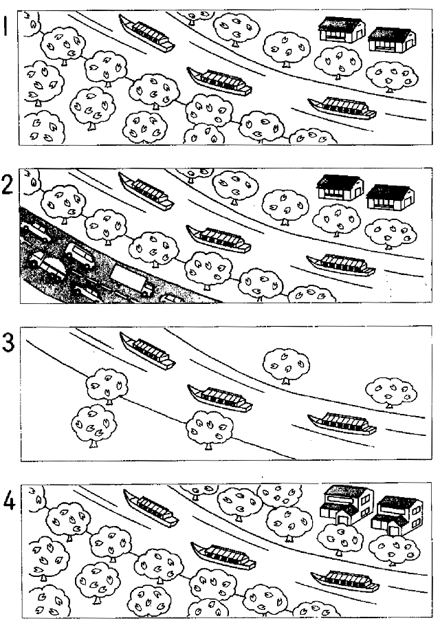 聴解スクリプト: (6) 昔このへんはどんな景色でしたか。 男:このへん、昔、川があったそうですね。 女:ええ、ちょうど、あの大きい道のところです。あそこは川だったんですよ。川の両側に桜の木がたくさんあってね。春にはお花見の人でいっぱいになったんですよ。 男:ええ、家は全然なかったんですか。 女:それはおりましたよ。でも、今のように建物ばかりじゃなかったし、2階の家なんて一軒もなかったんですよ。 昔この辺がどんな景色でしたか。