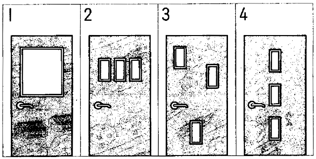 聴解スクリプト: (7) 男の人と女の人が新しい家につけるドアを選んでいます。どのドアにしますか。 男:今度建てる家、玄関のドア、どれにする? 女:ドアもいろいろあるわね。 男:木でできたものはいいと思うんだけど。これはどう思う?大きいガラスの窓のついているの。 女:明るくていいけど、窓が大きすぎると、少し弱くなるんじゃない。それより、その小さい窓が三つ並んでいるのはどう? 男:そうだね。でも、同じ小さい窓が三つでもまっすぐ並べてあるじゃなくて、この彩りのところについているのはどうかな。 女:うん、ちょっとおもしろいわね。そうしましょう。 男:じゃ、これを頼んでおくよ。 女:お願いね。 新しい家のドアはどれになりますか。