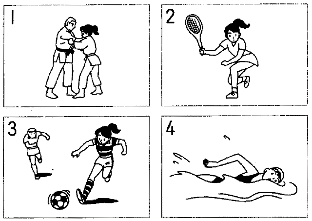 聴解スクリプト: (8) 男の人と女の人がスポーツについて話しています。女の人がするスポーツはどれですか。 男:木村さんはどんなスポーツをするんですか。 女:何だと思いますか。 男:ジョギングとか水泳? 女:いや、一人でするスポーツはだめなんですよ。 男:じゃ、二人でするものなら、テニス? 女:ボールを使うのもあまり。 男:じゃ、何ですか。 女:殴ったり、殴られたるするようなスポーツ。 女の人がするスポーツはどれですか。