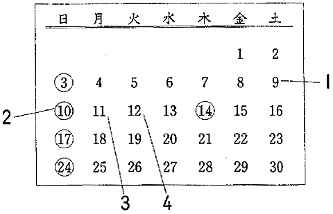 聴解スクリプト: (9)夫婦でカレンダーを見ながら、旅行の計画を立てています。二人はいつ出発しますか。 女:お父さんの休みって、8日から18日だったわね。 男:うん。旅行どうしようか。 女:3日間か、4日間かな。 男:3日間がいいよ。 女:そうね。じゃ、3日間にしましょう。休みがあると、高くなるし、混むから。土曜、日曜はやめたほうがいいじゃないかしら。 男:そうだなあ。14日も休みだね。 女:ええ、14日も入らないようにしましょう。 二人はいつ出発しますか。