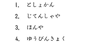 聴解スクリプト: (12) 男の子とお母さんが話しています。男の子はこれからどこに行きますか。 子:行ってきます。 母:ちょっと、ちょっと、どこへ行くの? 子:駅の近く。切手の本、借りてくる。 母:自転車で? 子:ううん、歩いて。 母:気をつけてね。 子:行ってきまーす。 男の子はこれからどこに行きますか。