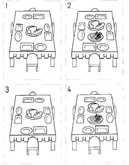 聴解スクリプト: (2) 男の人がテーブルの準備をします。どのようにしますか。 女:あなた、お客様来るから、手伝って。 男:ああ、いいよ。 女:パンのお皿を持っていて、そのテーブルの真ん中に置いてね。 男:うん、果物は。 女:まだいいわ。 男:お皿も置いとくね。 女:うん、お願い。丸いのと四角いのね。四角いのは右ね。 男の人はテーブルの準備をどのようにしますか。