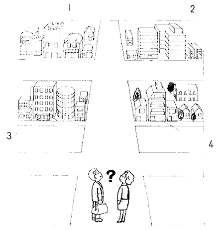 聴解スクリプト: (3) 男の人と女の人が話しています。東ホテルはどこですか。 男:すみません。東ホテルはどこですか。 女:この先2本目を左に入って、3軒目ですよ。 男:あの大きい通りですか。 女:いいえ、あれは3本目、間に狭い道があるんです。 男:そうですか。どうも。 東ホテルはどこですか。