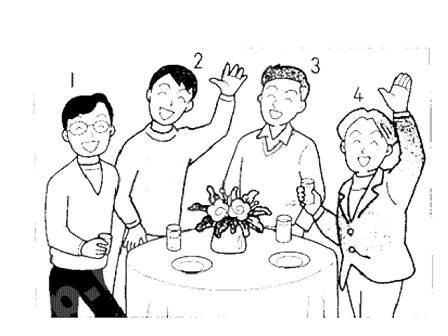 聴解スクリプト: (4) 男の人と女の人が話しています。男の人はどの人について聞いていますか。 男:あれはこの前のパーティーの写真? 女:そう。きれいに撮れたでしょう。 男:うん。あれ、あの人、だれ? 女:ええ、どの人? 男:ほら、花の横の、手を挙げている人。 女:えっ、コップ持って? 男:ううん、その人じゃなくて。 女:ああ、山田さんよ。 男の人はどの人について聞きましたか。