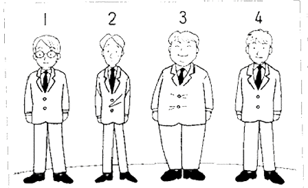 聴解スクリプト: (7) 女の人が二人で話しています。女の人の友達は写真のどの人ですか。 女1:ねえ、愛子の彼って、どの人? 女2:どれかな。 女1:この人? 女2:そんなに太ってないわよ。 女1:じゃあ、この人? 女2:そんなに痩せてないわよ。 女1:眼鏡はかけてるの? 女2:ううん、勉強する時はかけるけど。 女の人の友達は写真のどの人ですか。