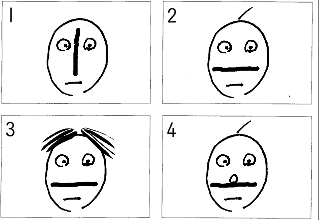 聴解スクリプト: 10ばん (お父さんとお母さんが話しています) この人たちの子供が描いた絵はどれですか? お父さん:この絵 何? お母さん:あ、それ?タクシーで描いたお父さんの顔。 お父さん:え、僕?どうして髪が一本だけなんだろう?僕は髪が多いのに。 お母さん:一本もないよりいいでしょう。 お父さん:この、真ん中に描いてある 長い横の線は何? お母さん:あ、それは鬚よ。 お父さん:あ?鬚か?鼻を描いてないから分からないんだよ この人たちの子供が描いた絵はどれですか?