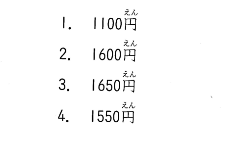 聴解スクリプト: 2ばん (男の人と女の人が話しています) 女の人は始めにいくら出しましたか? 男:はい、お客さん。全部で1600円です 女:はい 男:あれ、50円足りませんよ。 女:あらー 女の人は始めにいくら出しましたか?
