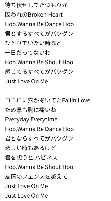 君のこと ずっともっと 知りたくて目を閉じる Anymore Again こんなLonely Days Now You Get Me Up Up a Denger よくあるキス 思わないで Heartより膝が震える Hold Me Tight 一秒先のふたりが スリルで見えない Hoo,Wanna Be Dance Hoo 君とならすべてがバツグン いけない夜もあとから 目覚めてみれば ハピネス Hoo,Wanna Be Shout Hoo 友達のフェンスを越えて Just Love On Me 君のこと きっともっと わかりたい 深くまで このままじゃ ただのBrand New Love Yes You Get Me Up Up a Denger 淋しげな仕草より くちびるの火花信じて Hold Me Tight |