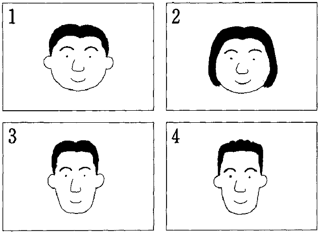 聴解スクリプト: 1番 青山さんはどんな顔をしていますか。 男:あ、鈴木さん、さっき青山さんという人が尋ねてきました。 女:青山さん? 男:ええと、男の人で、30歳ぐらいかな。 女:太っていました? 男:ええ、そうですね。丸顔でしたね。髪は短くて真ん中から分けていましたよ。 女:はっ、わかった。 青山さんはどんな顔をしていますか。