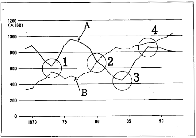 聴解スクリプト: 10番 男の人はグラフのどの部分を見てほしいと言っていますか。 男:ええと、このグラフはA社とB社の自動車の生産台数。つまりどのぐらい自動車を作ってきたかを示すグラフなんですが。その中でええと、A社のほうを見てください。80年から85年にかけて、一度大変低くなっていますが、それから伸びて、B社の生産台数に近づいた年です。そこです。その部分を見てほしいんですが、わかりますか。この時期なぜこのような変化が起きたかというのを… 男の人はグラフのどの部分を見てほしいと言っていますか。