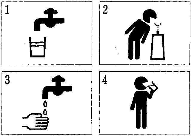 聴解スクリプト: 5番 二人の人が公園の案内板について相談しています。二人はどの案内板を使うことにしましたか。 女:あの、今度公園に立てる案内板のことなんですが。 男:ああ、水が飲める場所の。 女:ええ、いろいろ考えたんですが。 男:ああ、これなんか面白いね。コップなんか持っていて。 女:この水道のはどうでしょうか。 男:うん、すぐわかるかな。こちなんか手を洗うところって感じたな。やっぱり人が水を飲んでいるような絵がいいんじゃないか。 女:じゃ、これかこれですね。だけと課長、こっちだとジュースなんて見たいですね。 男:そうだな。じゃ、こっちにしよう。 二人はどの案内板を使うことにしましたか。